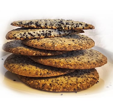 Thin, buttery cookies baked to a delicate crunch, packed with toasted white & black sesame seeds and a hint of vanilla – nutty, lightly sweet, irresistibly crisp.